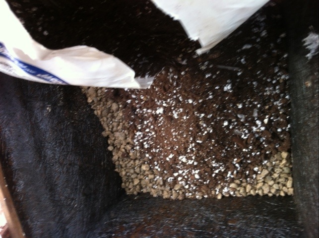 To start the planting process, we first partially filled the planters with gravel for drainage.