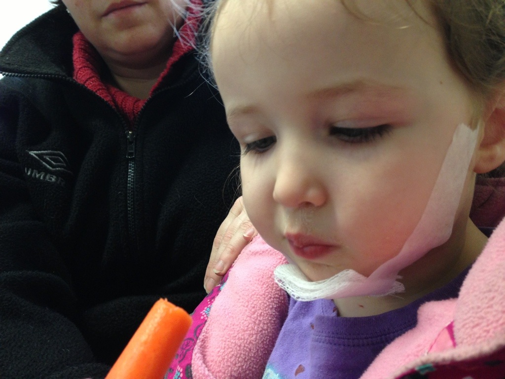 Tanit is having a snack of carrots as we wait in Emergency for her to get a stitch to close the little gash under her chin. This is turning into a hard lesson for sitting on her bum.